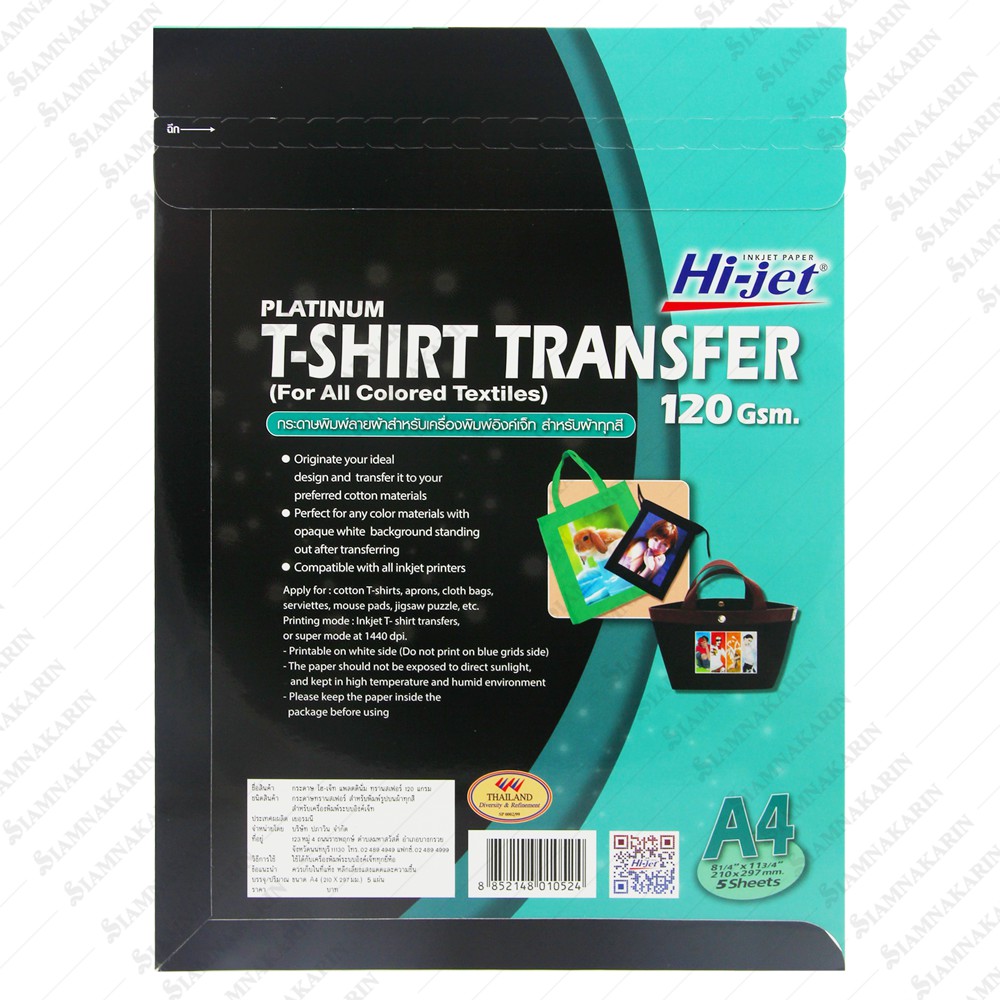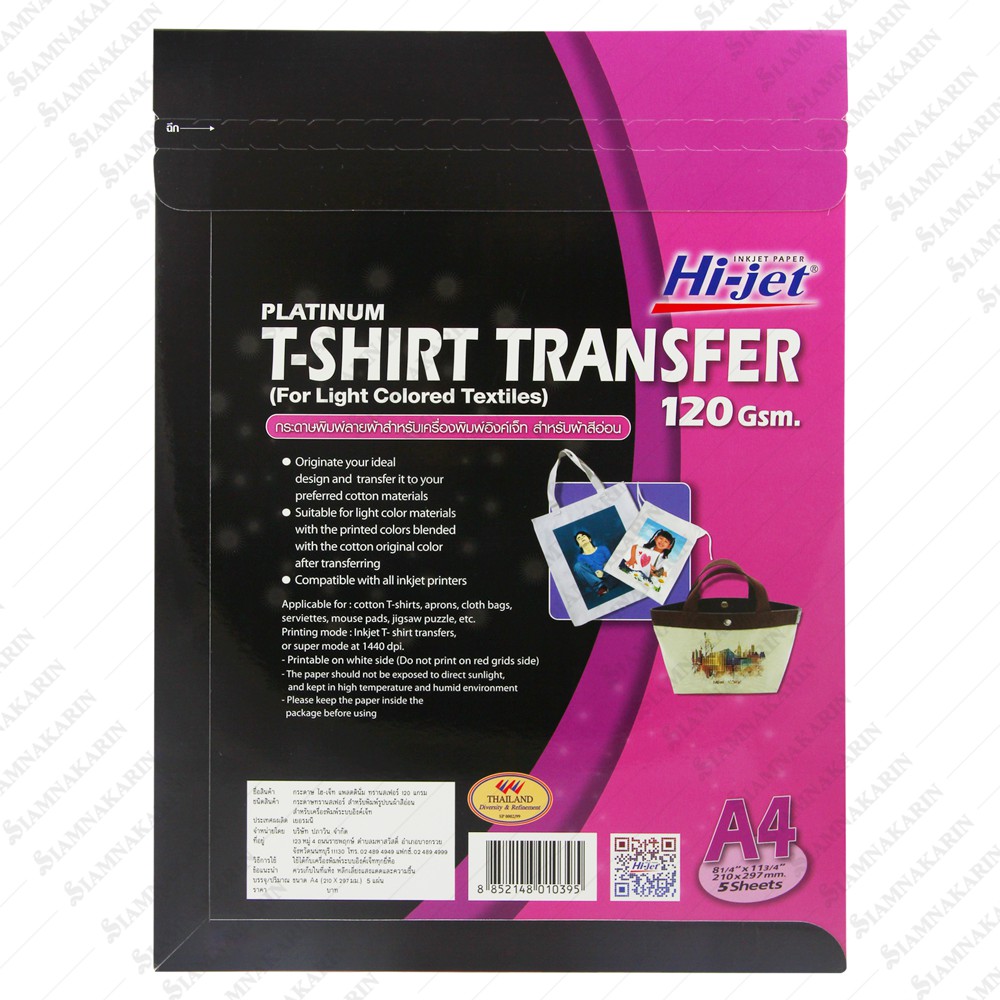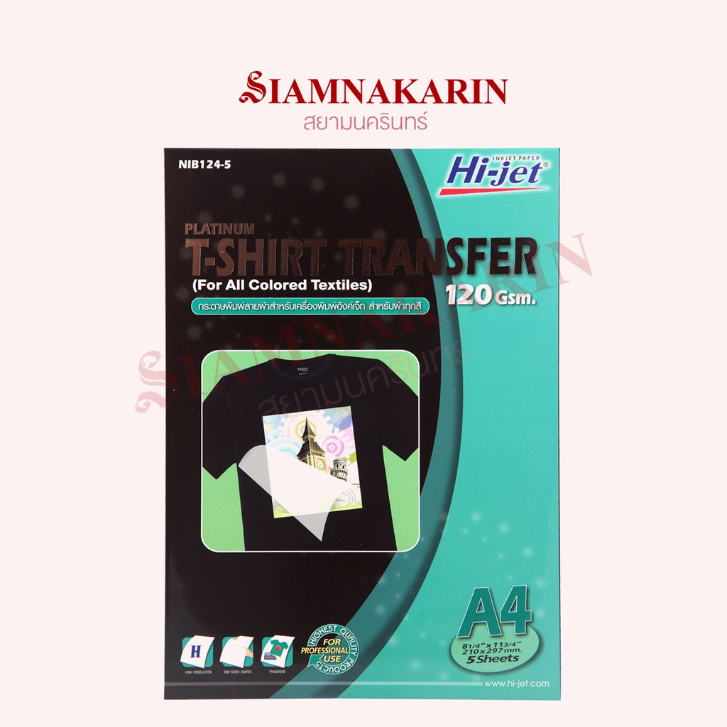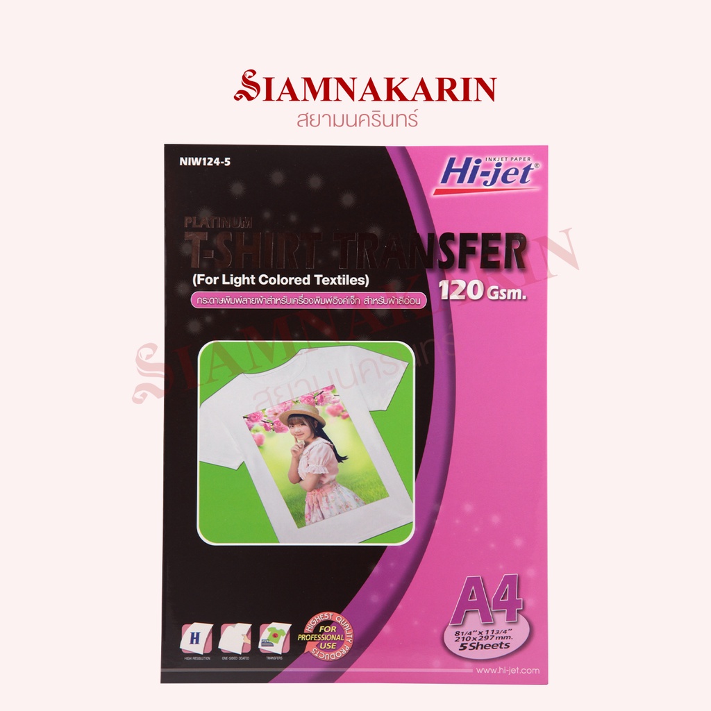 T-SHIRT TRANSFER กระดาษเคมีรีดเสื้อ 120 แกรม สำหรับผ้าทุกสี A4 / สำหรับผ้าสีอ่อน (5 แผ่น)