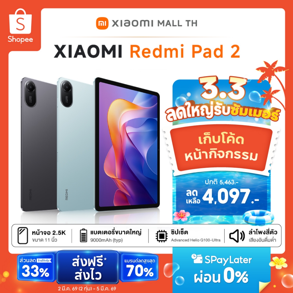 Xiaomi Redmi Pad 2 6/128 8/256แท็บเล็ต ชิปเซ็ต Advanced Helio G100Ultra แบตเตอรี่ 9000mAh พร้อมลำโพงสี่ตัว Dolby Atmos