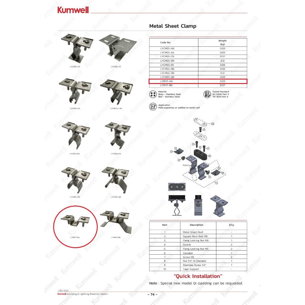 Kumwell เมทัลชีทแคลมป์ แบบเจาะยึด รุ่น LYRHT-AN แบบตัวยูหงายรับฐาน U-CLIP ทำจากสแตนเลสแท้ KUMWELL ของแท้(ราคาต่อชิ้น)