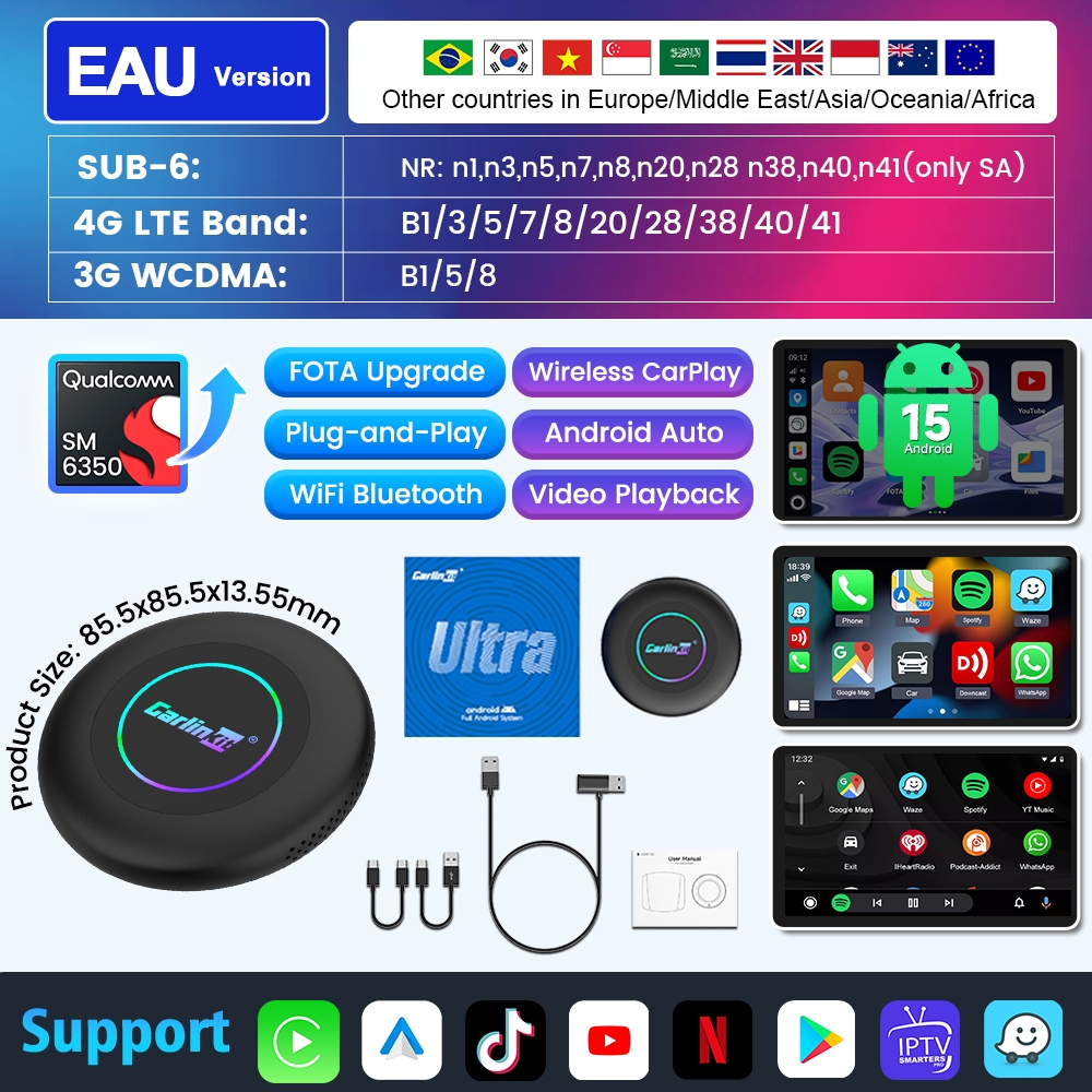 Carlinkit Tbox Ultra Android 15.0 CarPlay & Android Auto Wireless Adapter 8GB+128GB/256G BDual-Band WiFi GPS, Snapdragon SM6350 สําหรับระบบความบันเทิงในรถยนต์