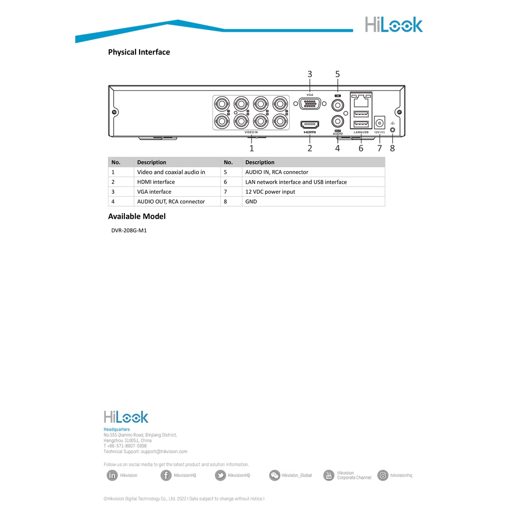 HiLook เครื่องบันทึกกล้องวงจรปิด 8 CH รุ่น DVR-208G-M1(C) รุ่นใหม่ของ DVR-208G-F1(S) รองรับกล้องวงจรปิด 2MP