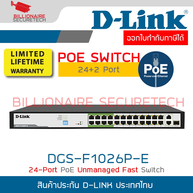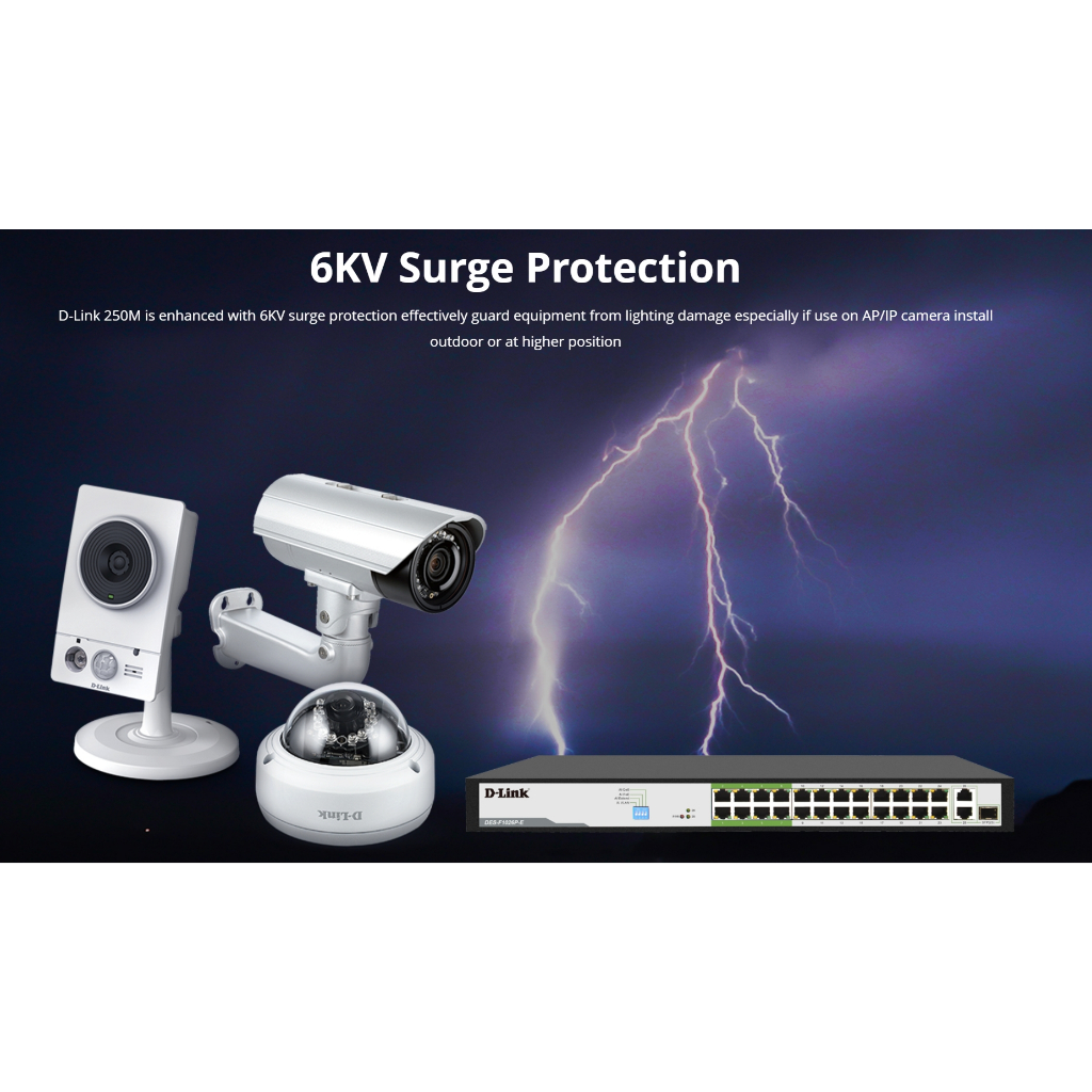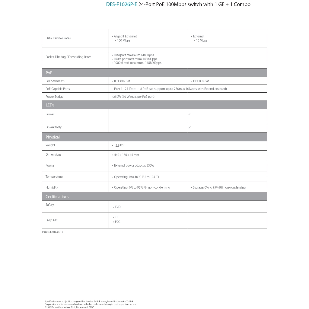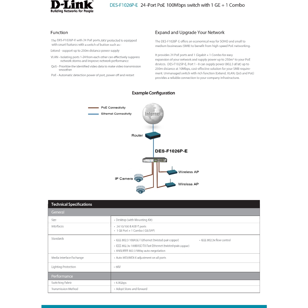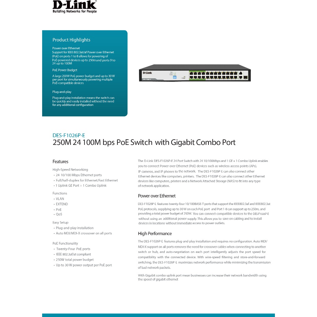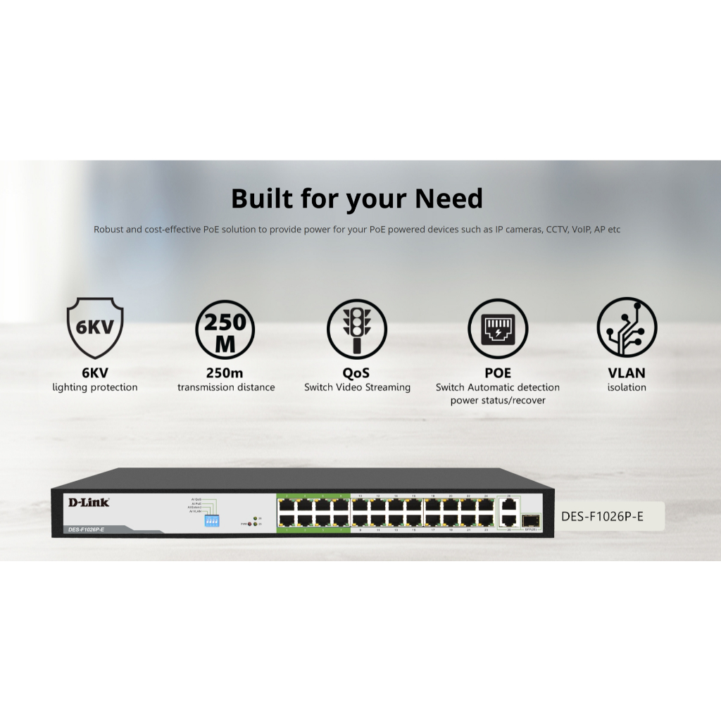 D-LINK DES-F1026P-E : 250M 24-Port Fast Ethernet PoE Switch with 24-port POE+ (250W) + 2 Gigabit Uplink Ports with 1 SFP