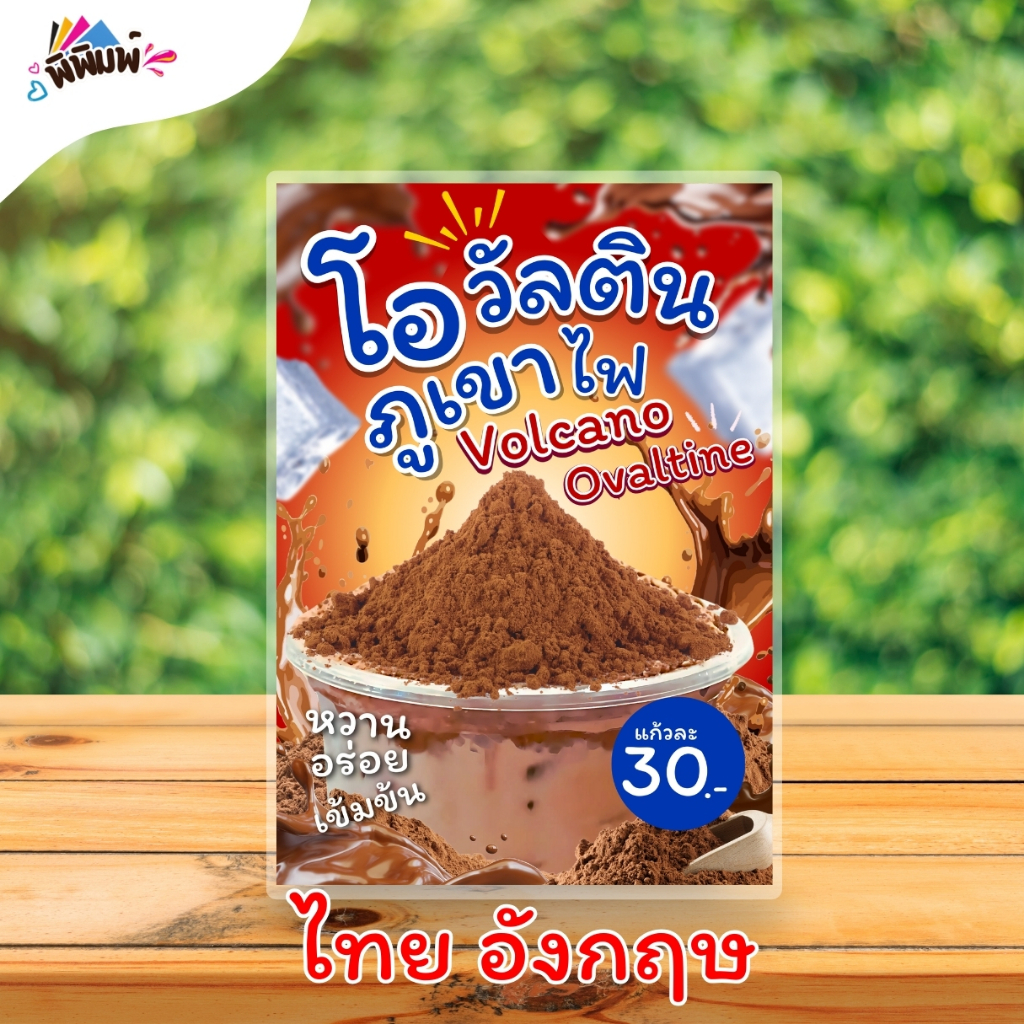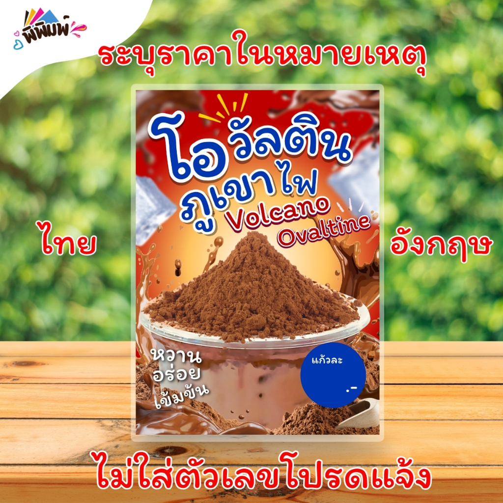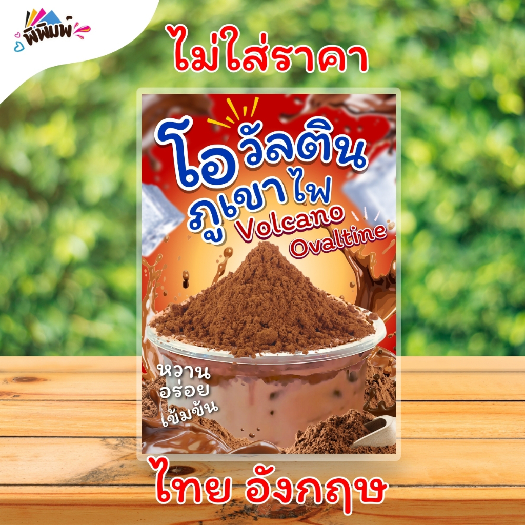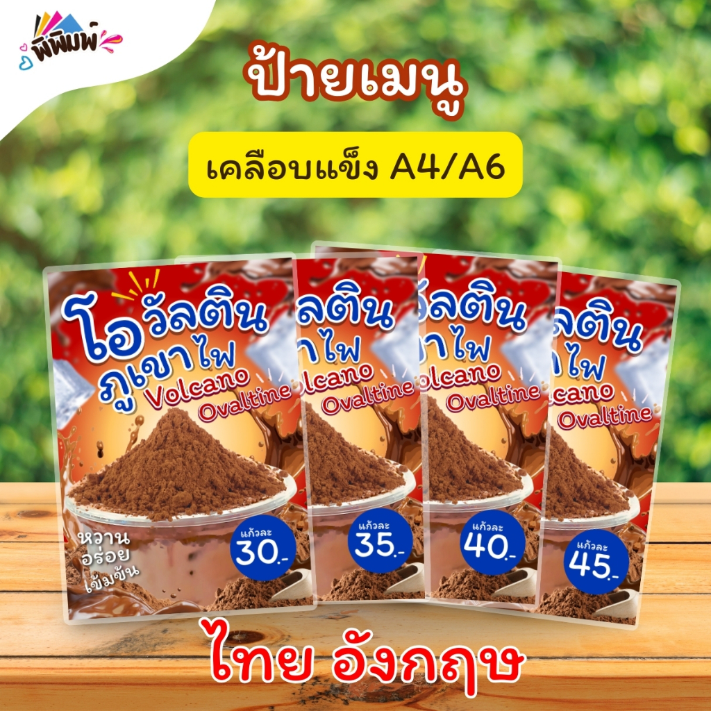 ป้ายเมนู โอวัลตินภูเขาไฟ / 2 ภาษา (แก้ว) A4 เคลือบแข็ง (A0108)