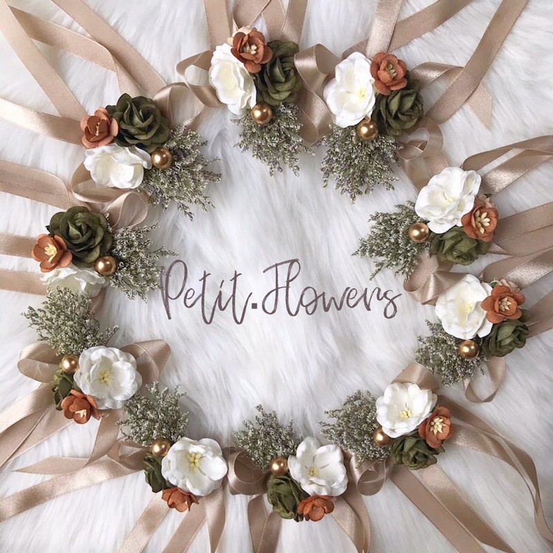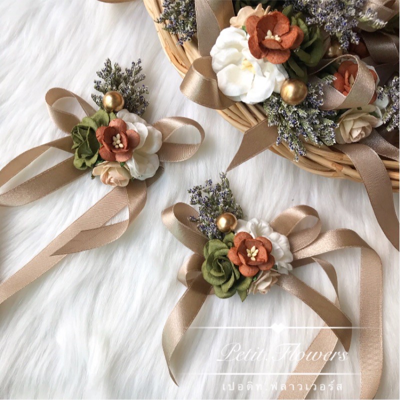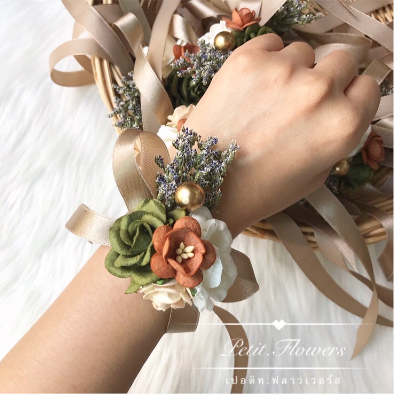 [จัดทำ 10 วัน ไม่มีพร้อมส่ง] ดอกไม้ผูกข้อมือเพื่อนเจ้าสาว ริบบิ้นผูกข้อมือธีมสีเขียวน้ำตาล