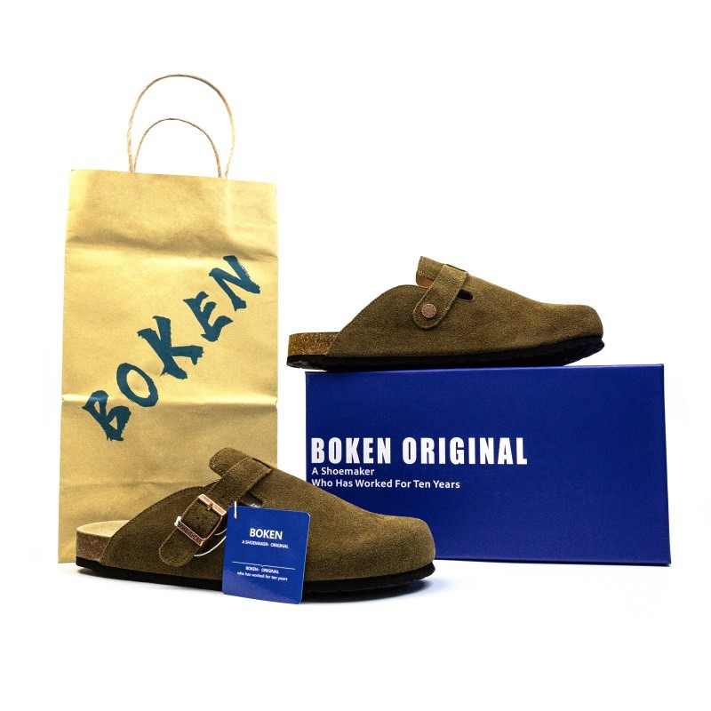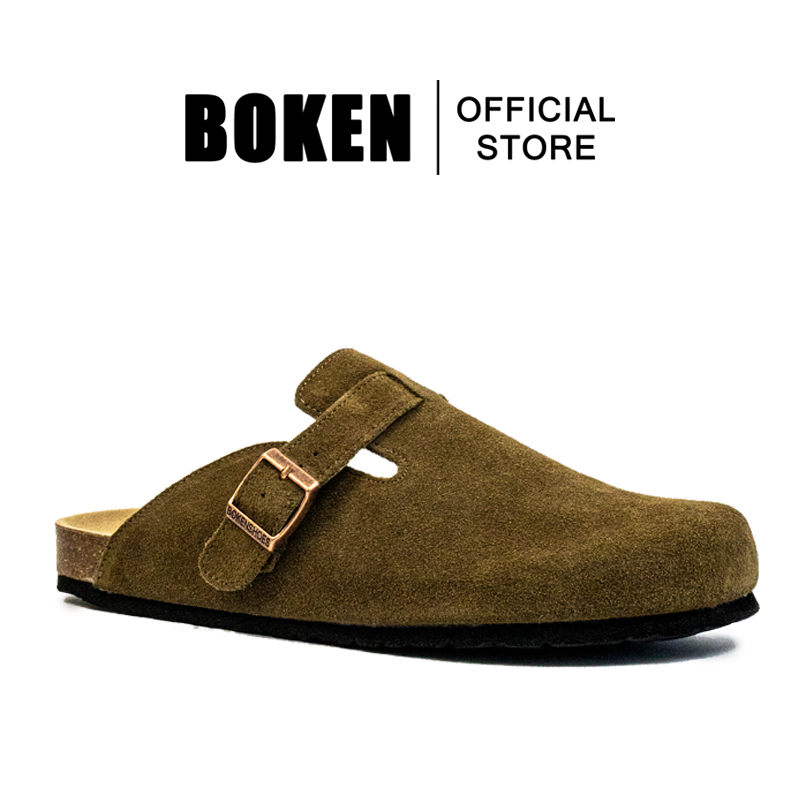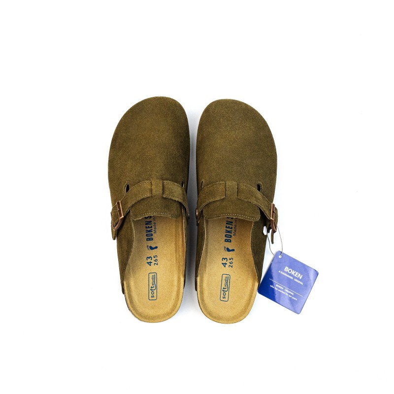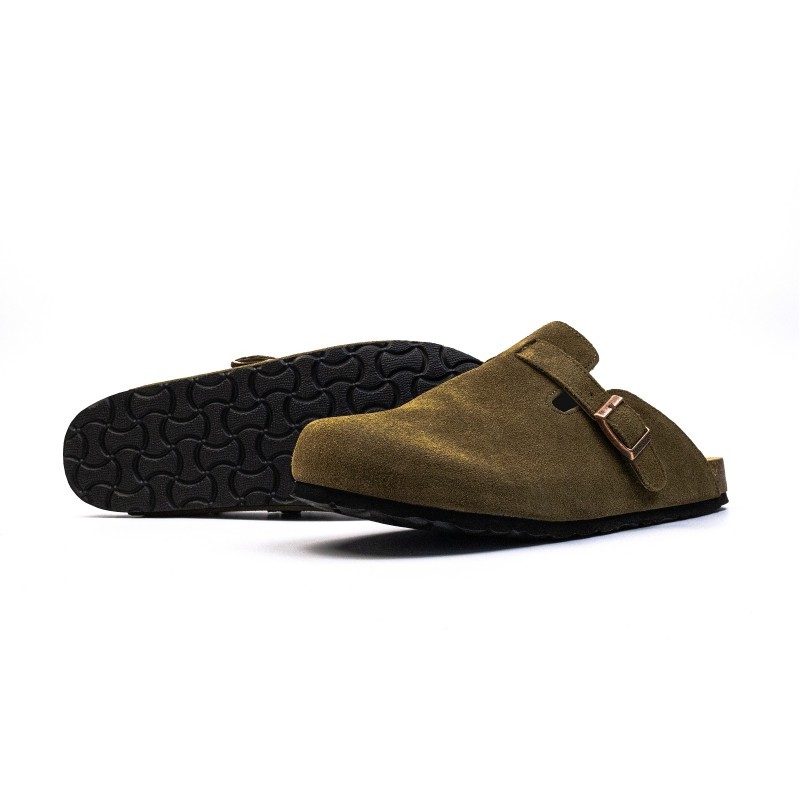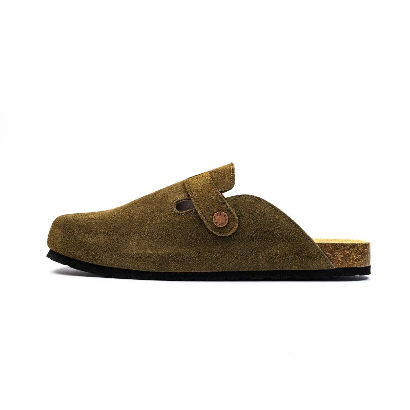 BOKEN รองเท้าแตะครึ่งกลางแจ้ง Mules Clogs สําหรับผู้ชาย Suede Cork รองเท้าแ ตะผู้หญิงคลาสสิกชายหาดรองเท้าแตะแบน Army สีเขียว