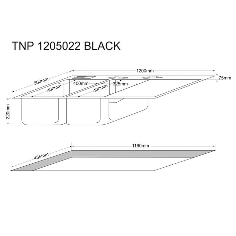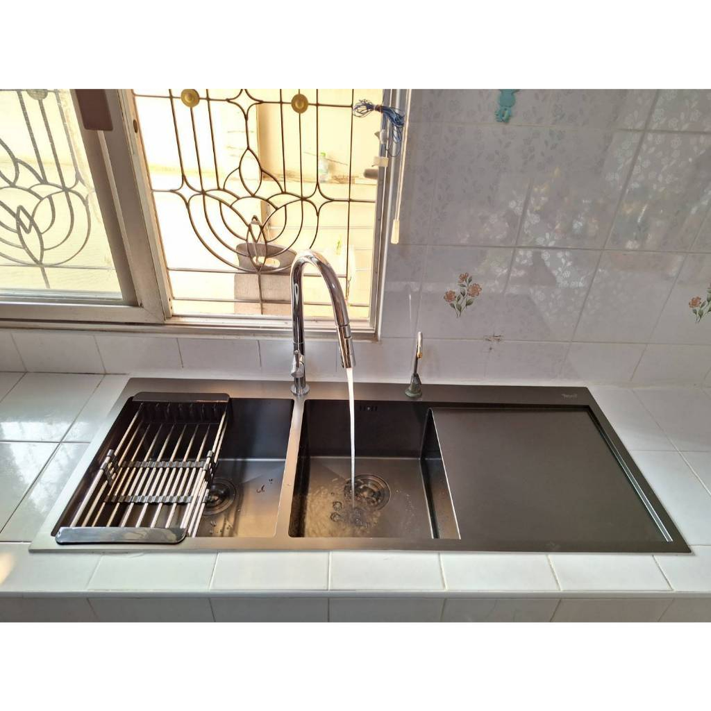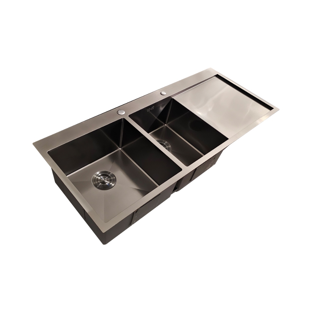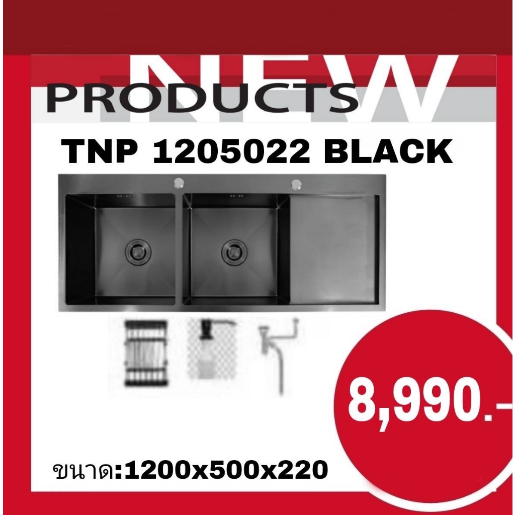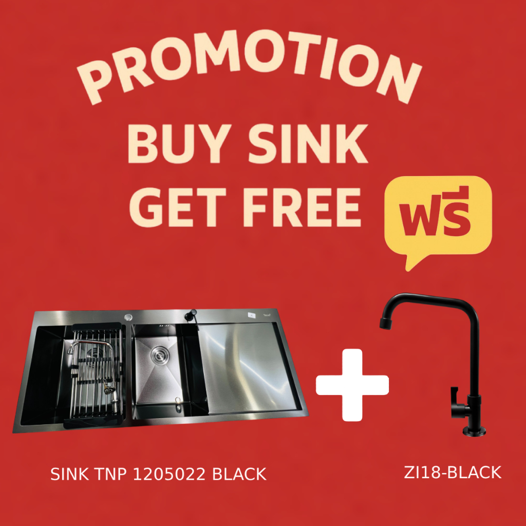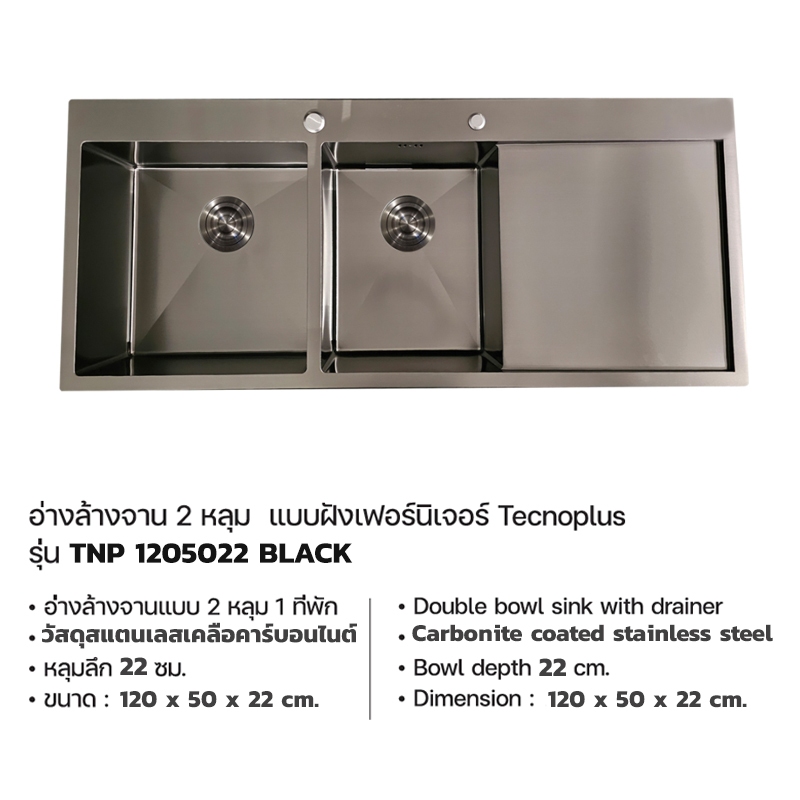TECNOPLUS อ่างล้างจาน 2 หลุม 1 ที่พัก สีดำ รุ่น TNP 1205022 BLACK แถมฟรีก๊อกซิงค์ สีดำ(ยืน) ZI18-BLACK