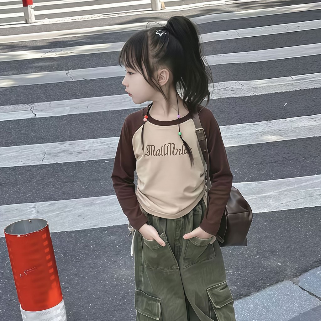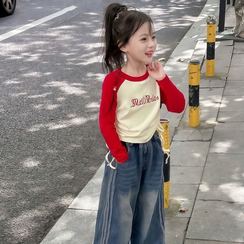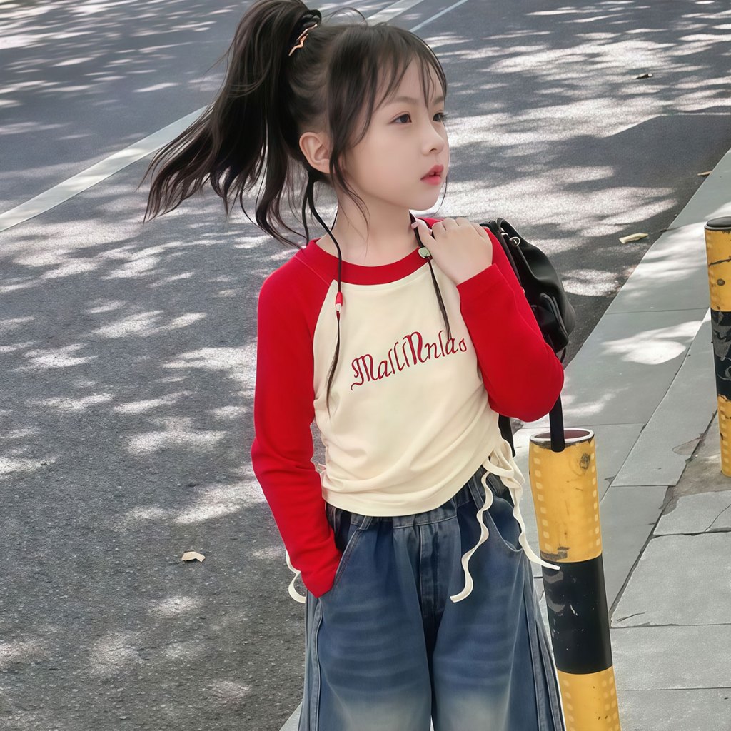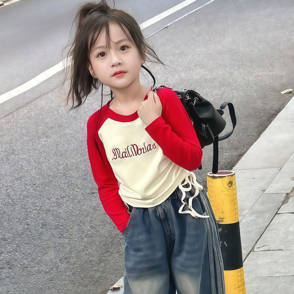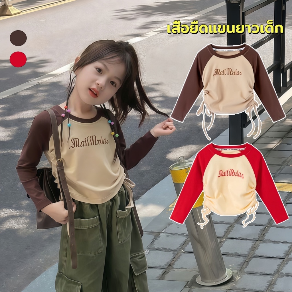 Beryl kids🌸เสื้อแขนยาวเด็ก🎀เสื้อยืดคอกลมเด็กผู้หญิง พิมพ์ลายตัวอักษรแฟชั่นสไตล์อเมริกัน ทรงพอดีตัวพร้อมดีไซน์เอวจีบ