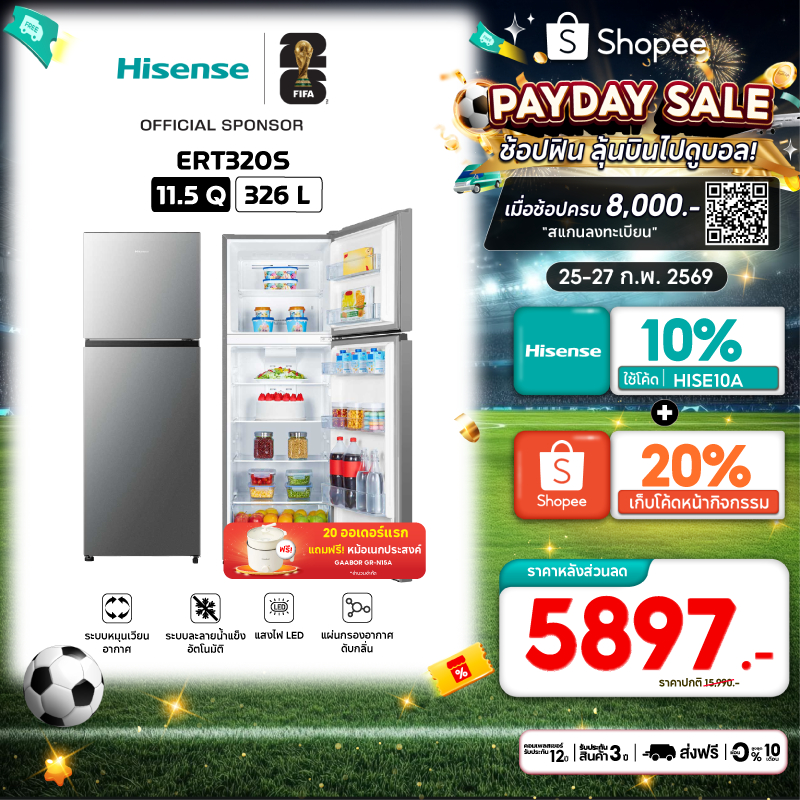 (Presale พร้อมส่ง 5 มี.ค) Hisense รุ่น ERT320S ตู้เย็น 2 ประตู :11.5Q/326 ลิตร