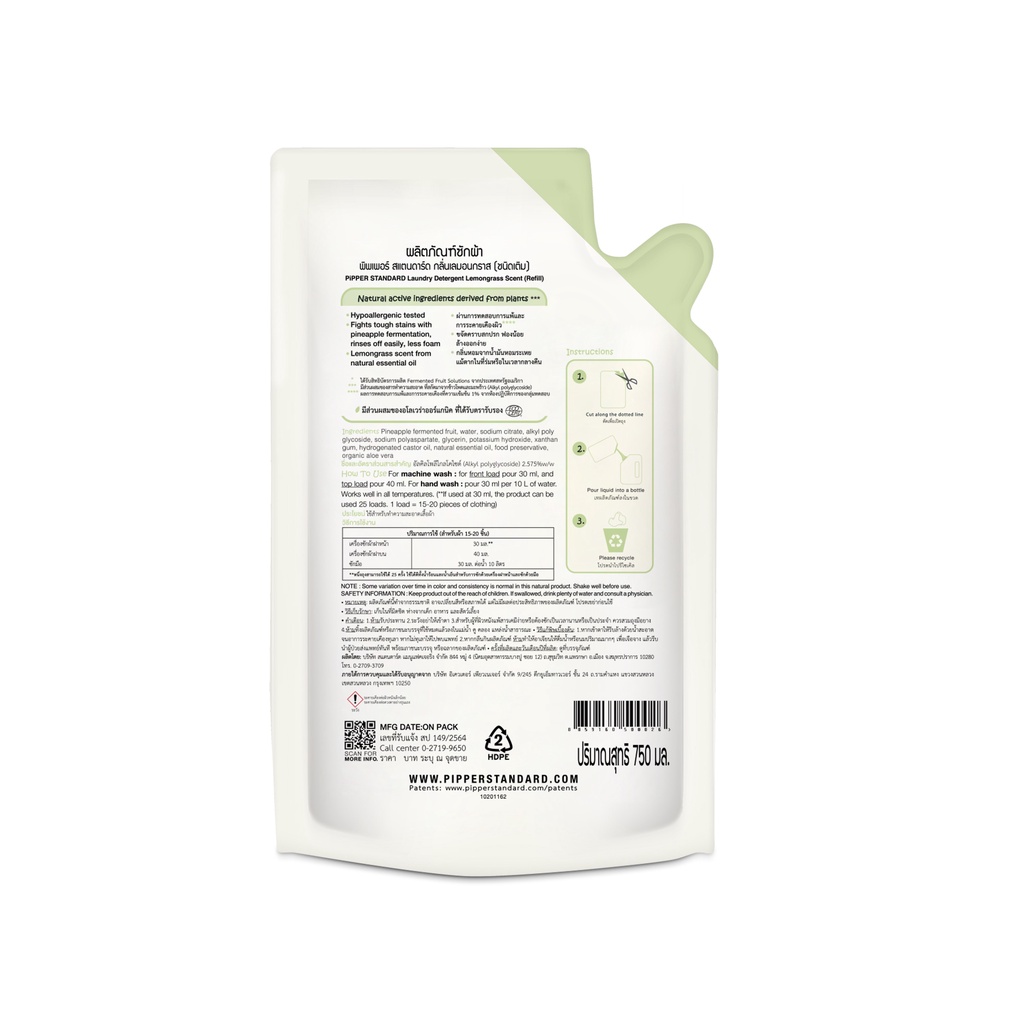 Pipper Standard Value Pack ผลิตภัณฑ์ซักผ้ากลิ่นเลมอนกราส ขนาด 750 มล. จำนวน 2 ถุง.ราคาปกติถุงละ 185 บาท