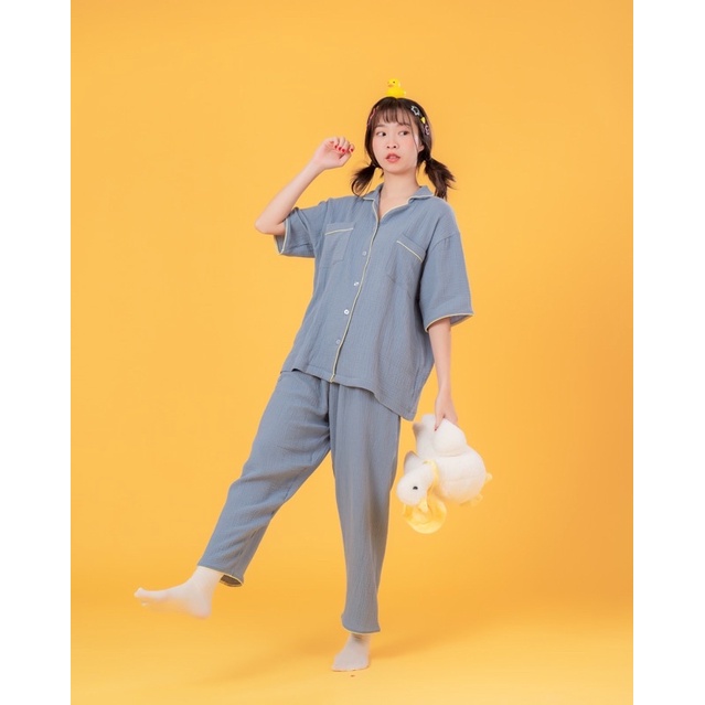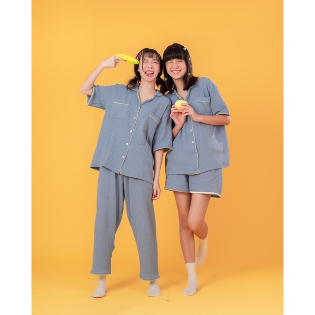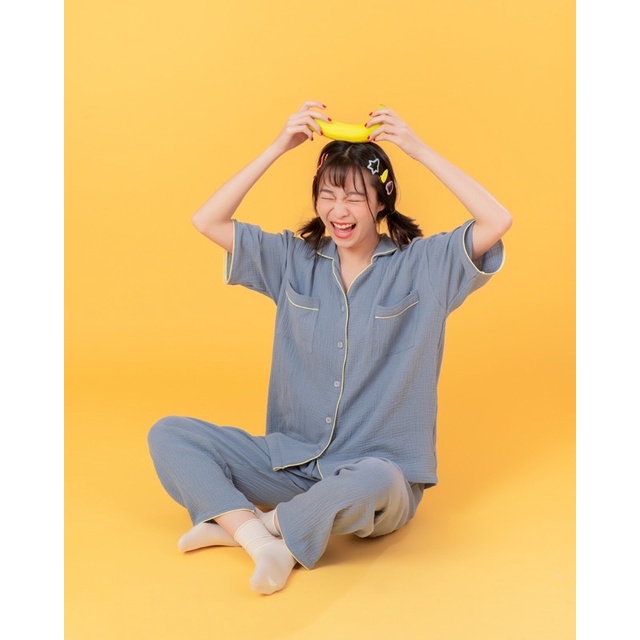 zedsterday | 🍌 blue banana croffle pajamas ชุดนอนผ้าย่น ไม่มีวันยับ สีน้ำเงินขอบเหลือง